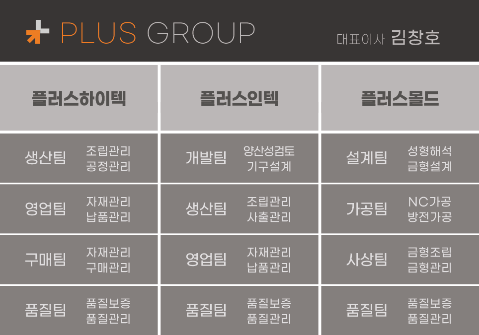 2015년 06월 - ㈜ 칠성하이텍 법인설립 (경기 부천)2015년 12월 - 본사 이전 및 조립 사업부 구축 (인천 서구)2016년 08월 - 플러스인텍 설립 및 사출 제1공장 증설2016년 08월 - 골프존 협력사 등록 및 골프존 센서 사출 생산2016년 10월 - 아이센스 협력사 등록 및 혈당계 생산2017년 02월 - 혈당계 ISO 13485 의료기기 제조 인증 취득2017년 05월 - 연구개발전담부서 설립 및 벤처기업등록2018년 12월 - 인코어드테크놀로지스 IoT 전기계량기 사출 생산2019년 11월 - LED 마스크 ISO 13485 취득 및 생산2020년 11월 - 넥서포터 ISO 13485 취득 및 생산2021년 12월 - KGMP 인증(의료기기 제조 인증) 취득2021년 12월 - 연구개발전담부서 기술연구소 변경 신고2023년 01월 - 기술혁신형 중소기업(Innobiz) 확인서 취득2023년 01월 - 혈당기 조립장치 2종 디자인 등록2023년 12월 - 칠성하이텍 신공장 이전2023년 12월 – 칠성하이텍 플러스하이텍으로 사명 변경2024년 04월 - 플러스몰드 금형 사업부 설립 (인천 서구)2024년 05월 - 사출성형 제품 게이트 절단 장치 특허 등록